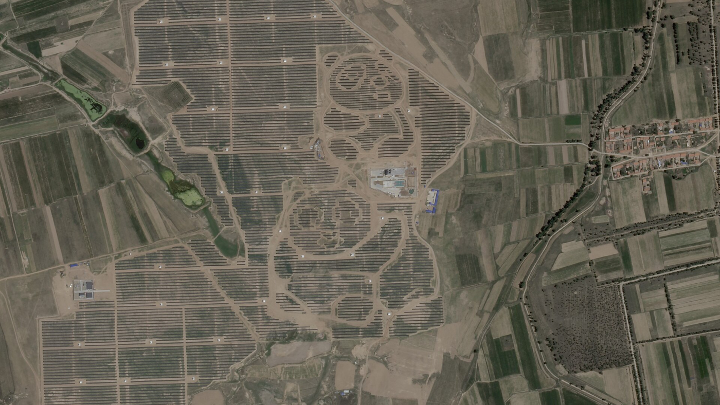 תחנת הכוח הסולארית "פנדה" (הנראית כפנדה מהאוויר) במחוז שנחי, סין, צילום: Plannet Lab, אושר לשימוש חופשי במסגרת ויקימדיה
