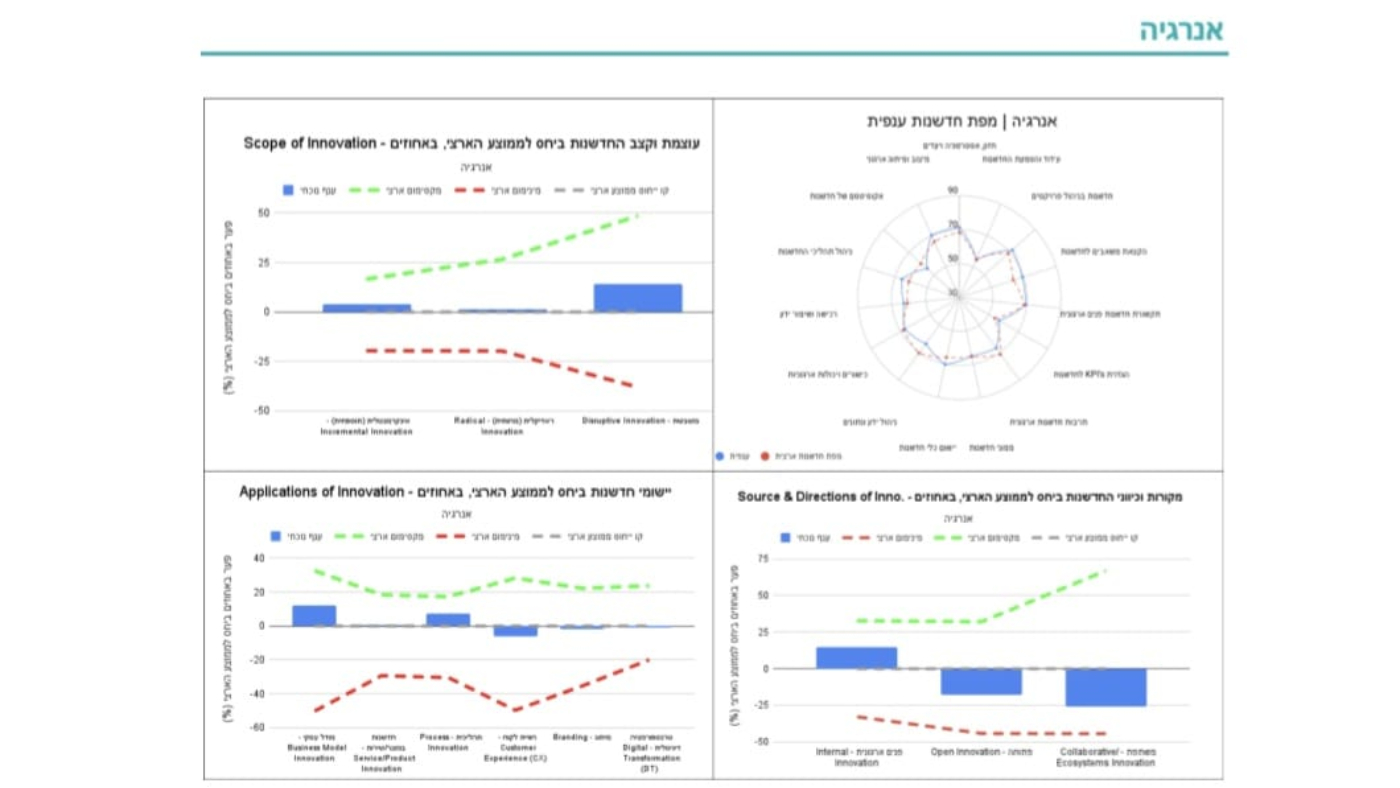 ענף האנרגיה קיבל בדו"ח "ציון חדשנות" של 65, קרוב לממוצע הכללי של "ציוני החדשנות" בכלל הענפים. הציון של הענף קרוב לממוצע ברוב הקטגוריות השונות המופיעות בדו"ח.