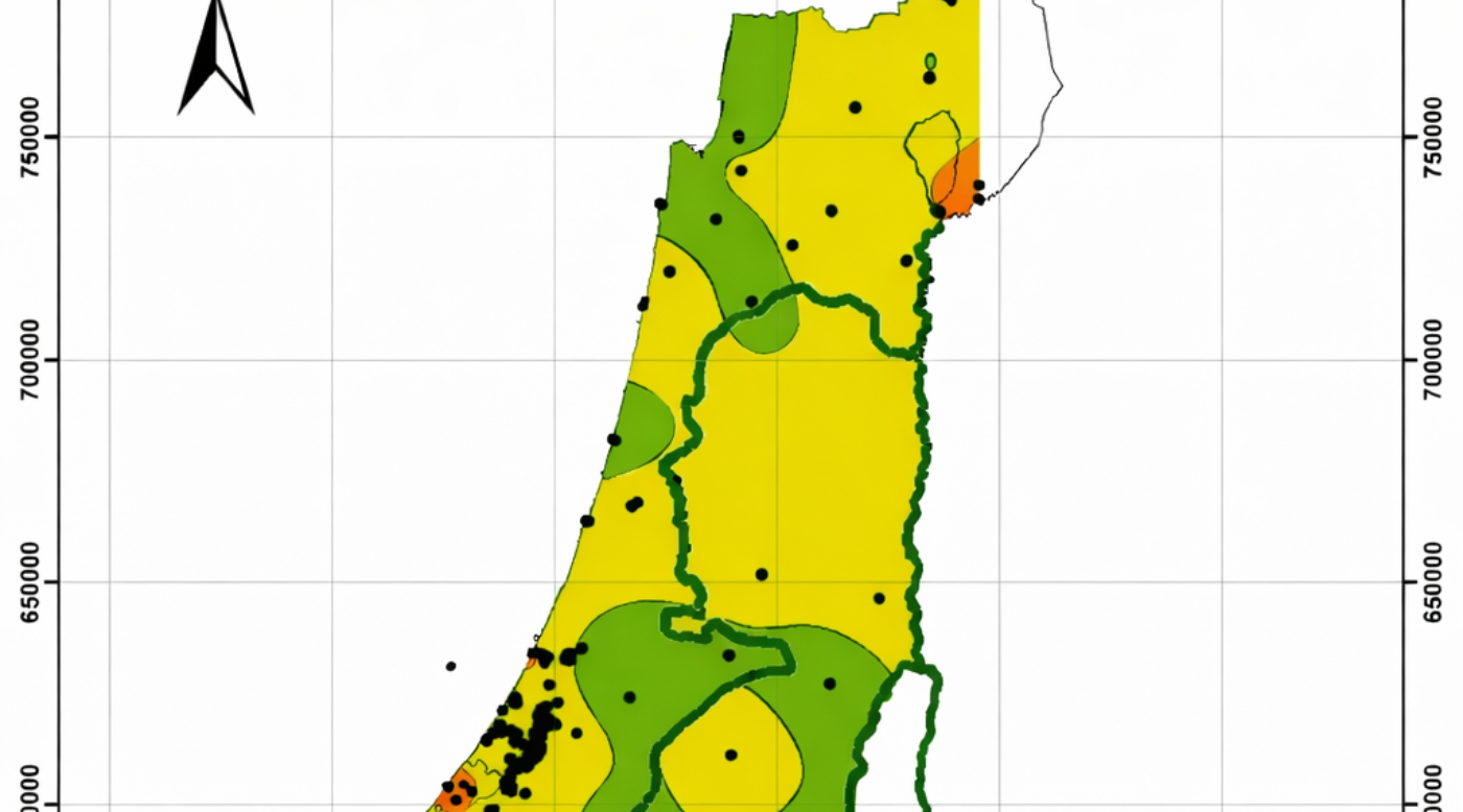 מפת הפוטנציאל הגיאותרמי בצפון ומרכז ישראל. באזורים המסומנים במפה בצהוב ואדום ניתן להפיק אנרגיה גיאותרמית בעומקים של פחות משישה ק"מ; באזורים הירוקים לא. מקור המפה: משרד האנרגיה