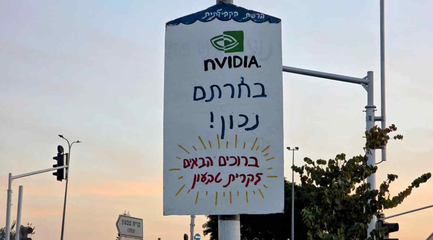 שלט בטבעון המברך על החלטת אנבידיה להקים משרדים בישראל. צילום: רפאל קאהאן